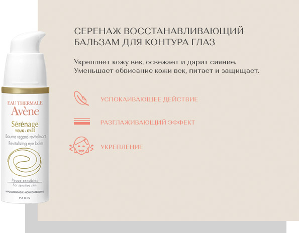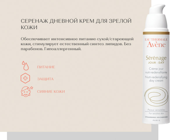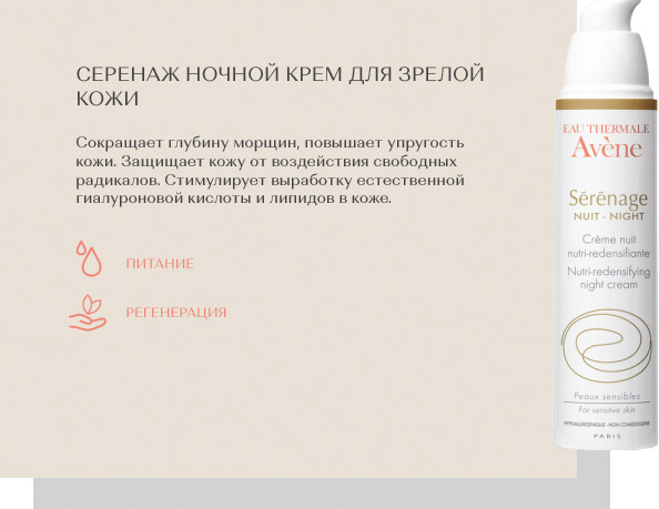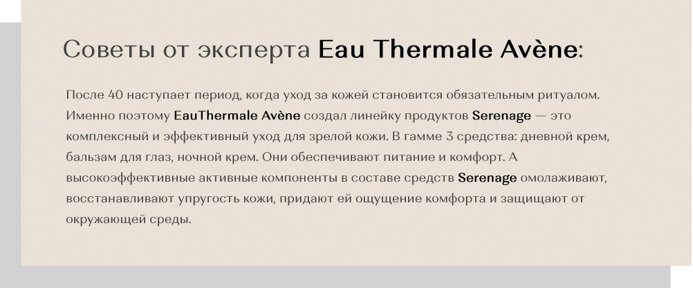 Начинается уход с умывания — как утром, так и вечером. Кожу важно хорошо и грамотно очистить: я использую легкие пенки или муссы. Затем протираю кожу увлажняющим лосьоном. И в завершении наношу питательный крем для лица и крем для глаз зимой и увлажняющий крем с более легкой текстурой и гель для глаз летом. Нельзя одним кремом пользоваться круглый год: летом кожа должна дышать и увлажняться, а зимой — защищаться от дождя, мороза и факторов стресса. Собираюсь попробовать линейку продуктов Serenage от Eau Thermale Avène для зрелой кожи. Там есть и дневной крем, и бальзам для глаз, и ночной крем. Слышала много хороших отзывов от подруг.